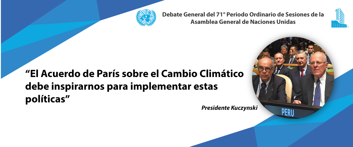 Pdte: @ppkamigo: “El Acuerdo de París sobre el Cambio Climático debe inspirarnos para implementar estas políticas” #PerúenlaONUpic.twitter.com/a00K6Psx7W
