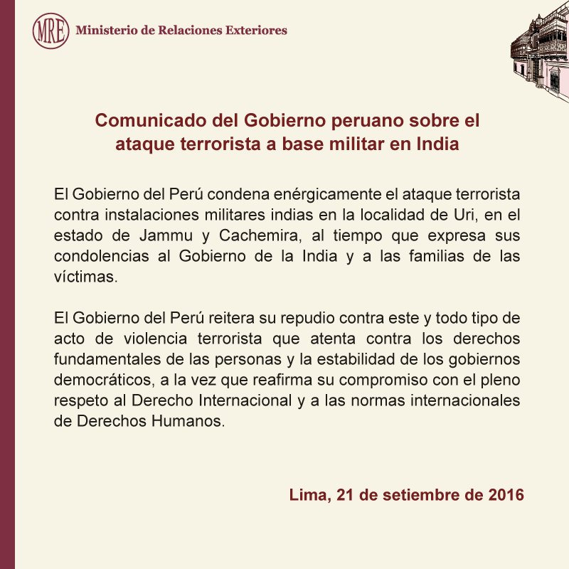 Gobierno del #Perú expresa condena y condolencias por ataque terrorista a base militar en #Indiapic.twitter.com/YijgTo17jF