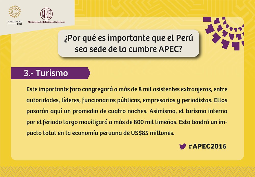 Echa un vistazo a esta info y entérate de qué manera la Semana de Líderes de @APEC beneficiará al #turismo en el Perú. #APEC2016pic.twitter.com/Gvchhkvz49