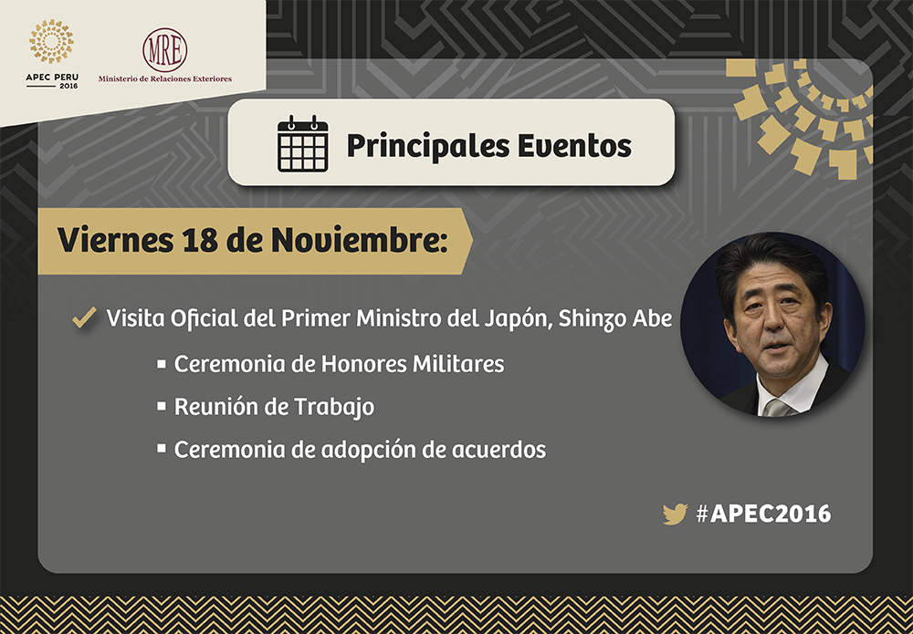 #Hoy: Presidente @ppkamigo recibirá la Visita Oficial del Primer Ministro de #Japón @AbeShinzo, quien participará en la Cumbre #APEC2016pic.twitter.com/cg69MQcshy