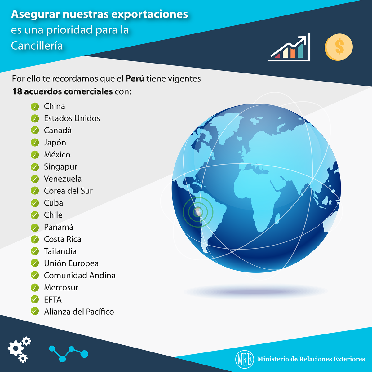 #BuenasNoticias | El #Perú tiene vigentes 18 #AcuerdosComerciales que buscan asegurar nuestras exportaciones. Echa un vistazo