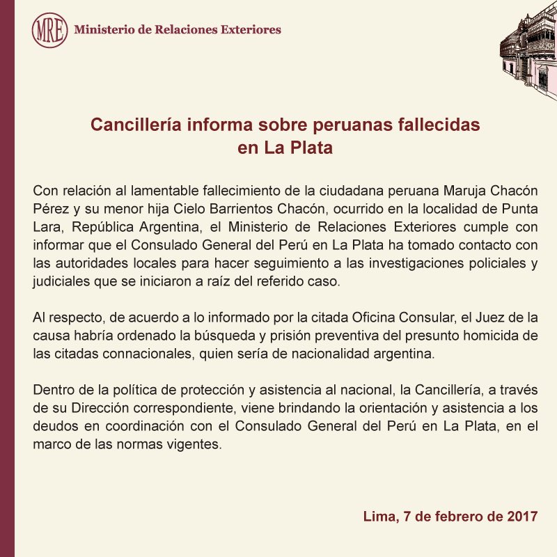.@CancilleriaPeru informa sobre lamentable fallecimiento de ciudadanas peruanas en #LaPlata, Argentina http://bit.ly/2kjSeQD pic.twitter.com/PmRY6mSHC2