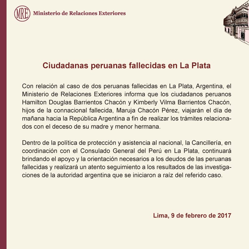 Actualización sobre caso de ciudadanas peruanas fallecidas en #LaPlata, Argentina http://bit.ly/2kscyiU #NiUnaMenospic.twitter.com/2IXzV8N7Fi