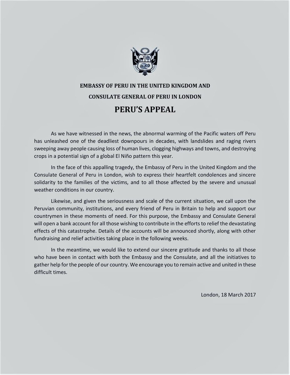 #UnaSolaFuerza| Información importante para quienes deseen apoyar desde #ReinoUnido a poblaciones afectadas en #Perú http://bit.ly/2mhGkM6 pic.twitter.com/oxzdTIYlmq