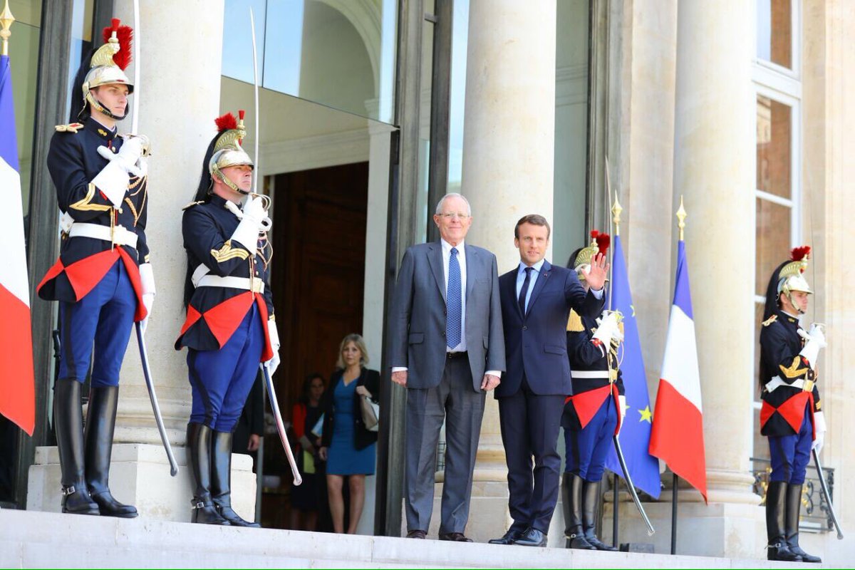 Presidente @ppkamigo es recibido por su homólogo francés @EmmanuelMacron en Palacio del Elíseo con quien sostendrá un encuentro bilateralpic.twitter.com/u4ZAU4NTRQ