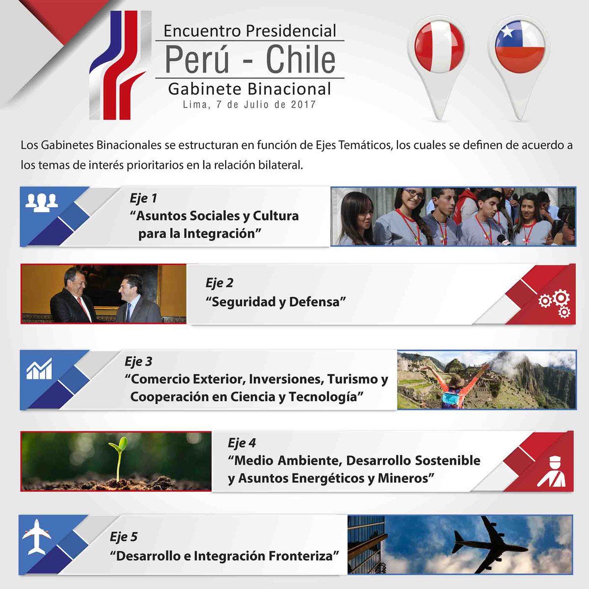 ✅ Conoce los ejes temáticos del I Gabinete #BinacionalPerúChile definidos según temas de interés prioritario en la agenda bilateral 🔽pic.twitter.com/Ok9F5tQ2Ce