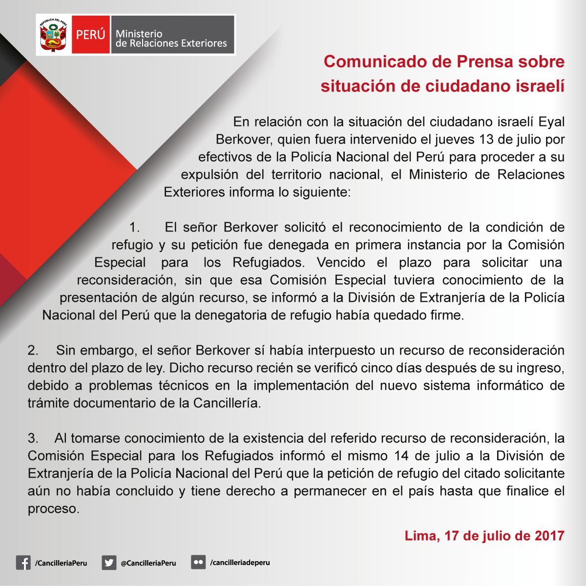 Sres RR.EE.incluir en su comunicado disculpas al ciudadano Eyal Berkover hubiera sido justo e idóneo, ha sido un bochornoso episodio público