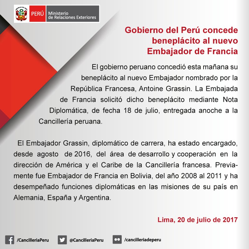 [COMUNICADO DE PRENSA] Gobierno del #Perú concede beneplácito al nuevo Embajador de #Francia http://bit.ly/2vFtDuO pic.twitter.com/n8RwwMPW7w