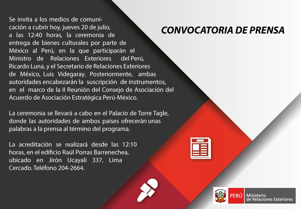 ¡Atención #periodistas 📢! Convocatoria para cubrir la ceremonia de entrega de bienes culturales por parte de #México al #Perú 🔽pic.twitter.com/xNEJaGmQyq