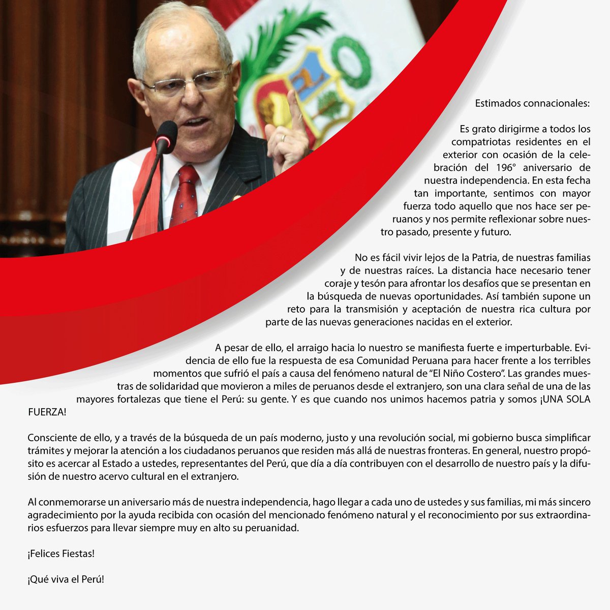 ✅ Compartimos el mensaje del Presidente @ppkamigo a la comunidad peruana en el exterior por Fiestas Patrias http://bit.ly/2h6FEHe pic.twitter.com/6HWpohIREe