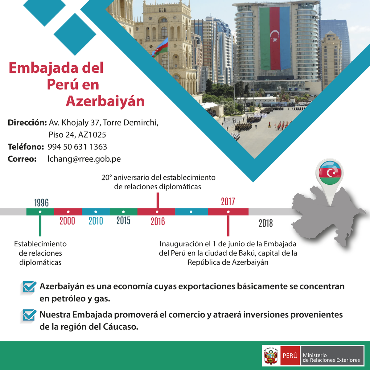 #InfoCancillería | ¿Sabías que el #Perú inauguró recientemente una Embajada en #Azerbaiyán? Echa un vistazo a esta infografía 🔽pic.twitter.com/hvceq4OcXc