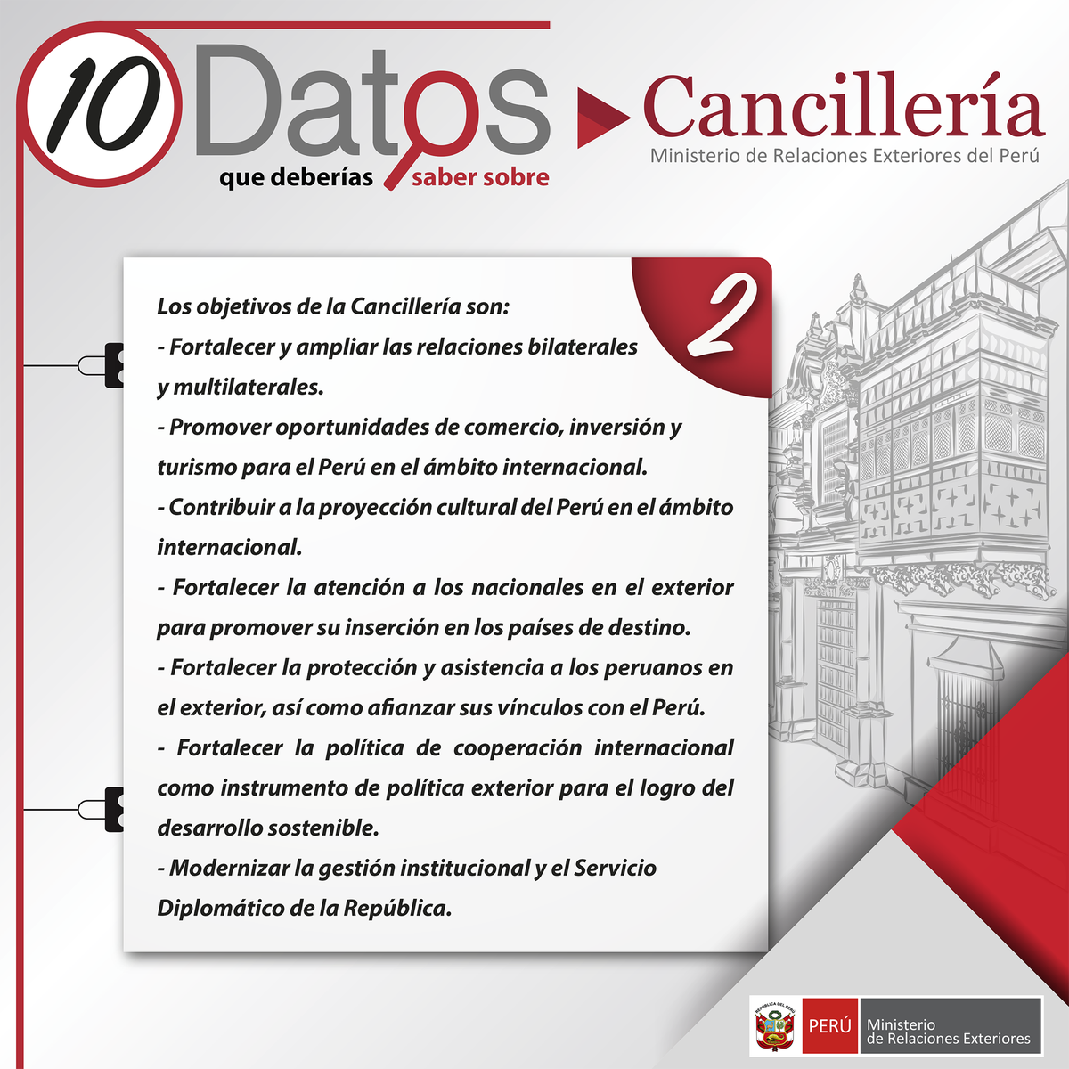 Ministerio de Relaciones Exteriores. Formulamos, ejecutamos y evaluamos la política exterior del país. Facebook: http://facebook.com/CancilleriaPeru