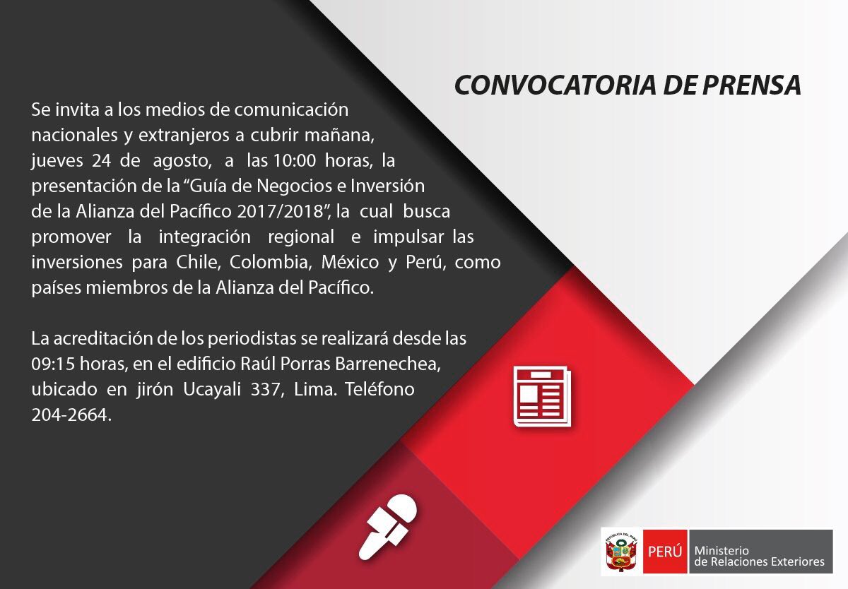 ¡Atención periodistas 📢! Presentación de la “Guía de Negocios e Inversión de la Alianza del Pacífico 2017/2018”. #Hoy a las 10.00 ampic.twitter.com/PzeqwDQmW3