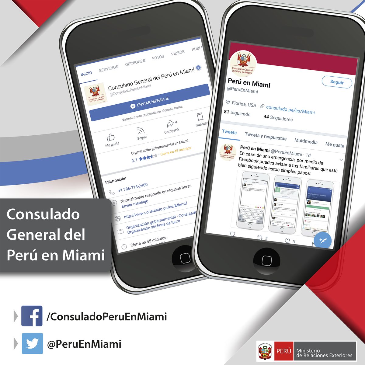 🚨 #PeruanosEnMiami pueden mantenerse al tanto de anuncios y recomendaciones del Consulado @PeruEnMiami a través de sus redes sociales ⤵️pic.twitter.com/LpjRvRMlBo