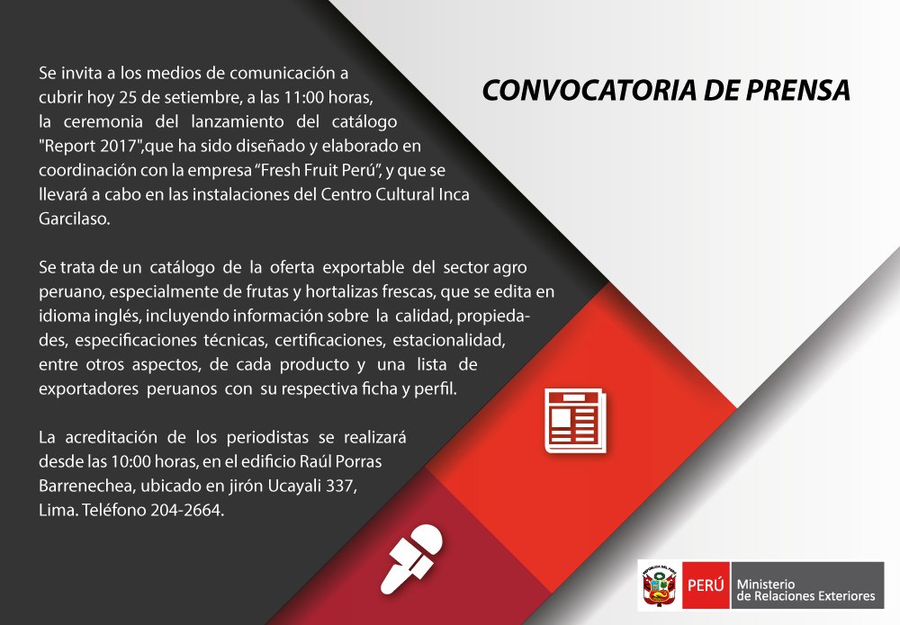 ¡Atención #periodistas 📢! Lanzamiento del catálogo de la oferta exportable del sector agro peruano "Report 2017". #Hoy a las 11:00 horaspic.twitter.com/HnwdzSfRli
