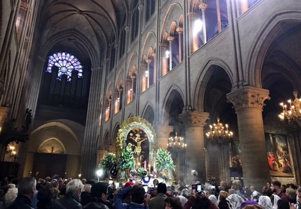 En #París | Rinden homenaje a #SeñorDeLosMilagros con misa en español y francés y ​procesión en Plaza de Catedral de Notre Damepic.twitter.com/9bR8MVRQgI