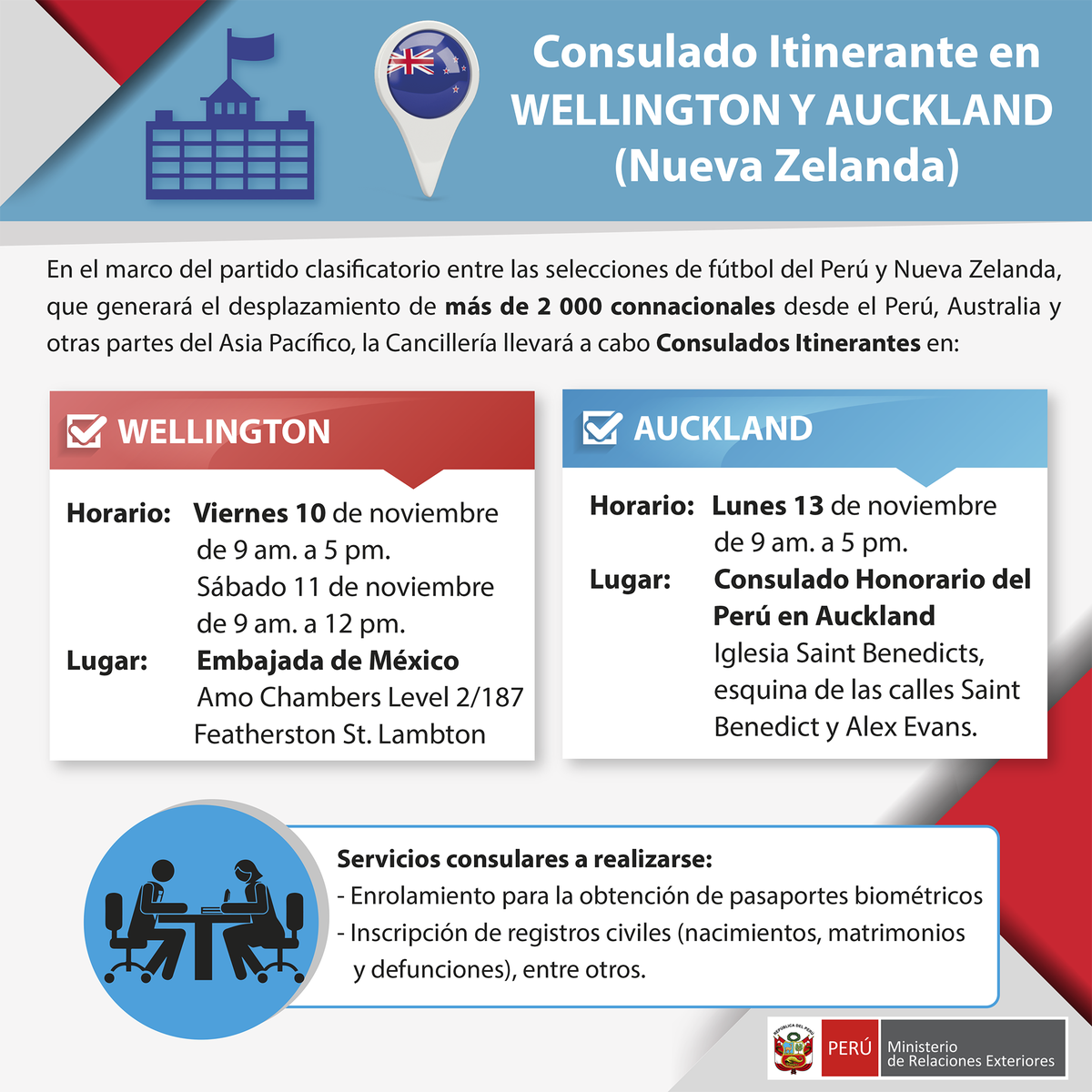 10 y 13 noviembre tendremos consulados itinerantes en Wellington y Auckland para atender trámites de connacionales http://bit.ly/2gMdqC4 pic.twitter.com/QYnfHpfz06