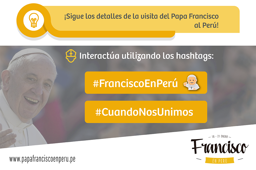#PeruanosEnElExterior | Estamos a minutos de la llegada de @Pontifex_es a nuestro país. ¡Participa de los pormenores de su visita usando los HT #FranciscoEnPerú #CuandoNosUnimos! Compartiremos streaming a través de @facebook https://www.facebook.com/CancilleriaPeru/ …pic.twitter.com/VQSe22DKBX