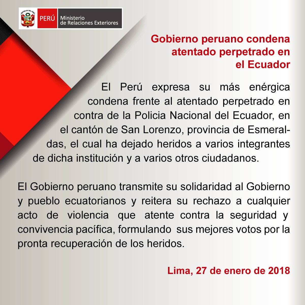 Gobierno peruano expresa su más enérgica condena frente a atentado perpetrado en cantón de San Lorenzo, Esmeraldas, #Ecuador http://bit.ly/2DQJcYb pic.twitter.com/dqED0TXQt6