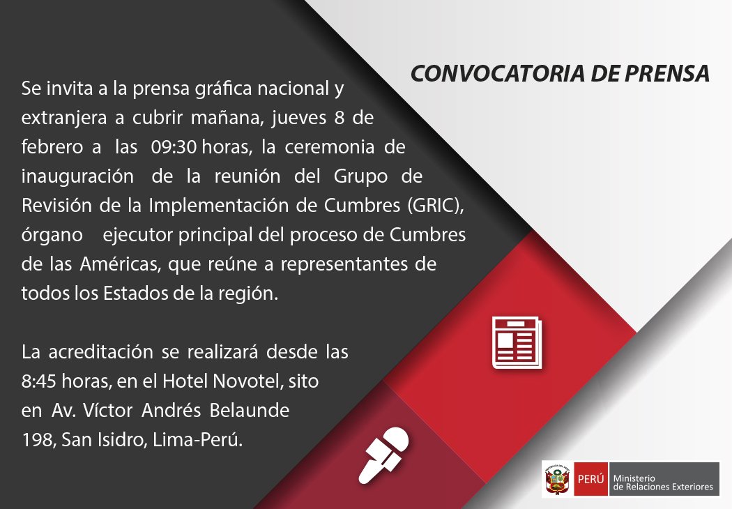 ¡Atención #periodistas 📢! Se invita a cubrir mañana, 09:30 horas, la ceremonia de inauguración de la reunión GRIC, órgano ejecutor principal del proceso de la #VIIICumbrePerúpic.twitter.com/GyByyURTbH