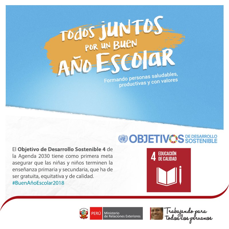 ¿Sabías que el #ODS4 de la #Agenda2030 suscrita por 193 Estados, entre ellos el Perú, tiene como primera meta asegurar que niñas y niños terminen la enseñanza primaria y secundaria? #BuenAñoEscolar2018pic.twitter.com/XyZrFBbdkA