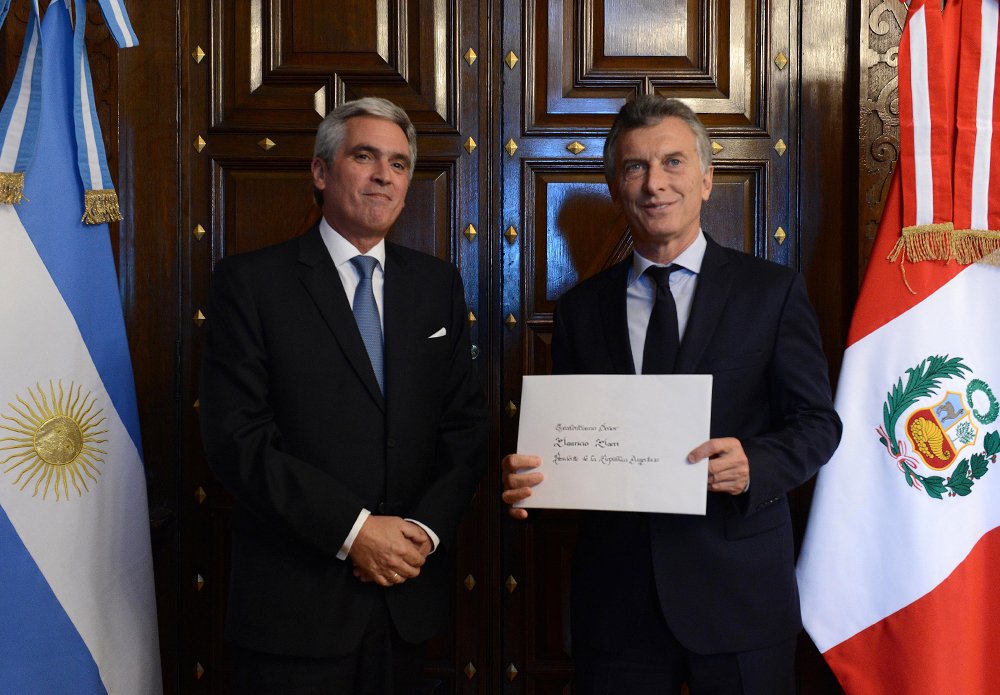 Embajador del Perú presentó Cartas Credenciales ante Presidente de Argentina, @mauriciomacri. Ambos expresaron su voluntad de continuar fortaleciendo las históricas relaciones de amistad entre ambos países http://bit.ly/2Hz44S3 pic.twitter.com/sohMrxUuWp