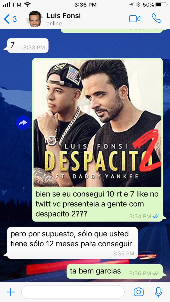 galera por favorrrrr RT!!! eu conversei com o luis fonsi e ele falou que se a gente conseguir 10 RT e 7 like ele nesse tuite ele libera despacito 2!!!!pic.twitter.com/IKyuyo3utk