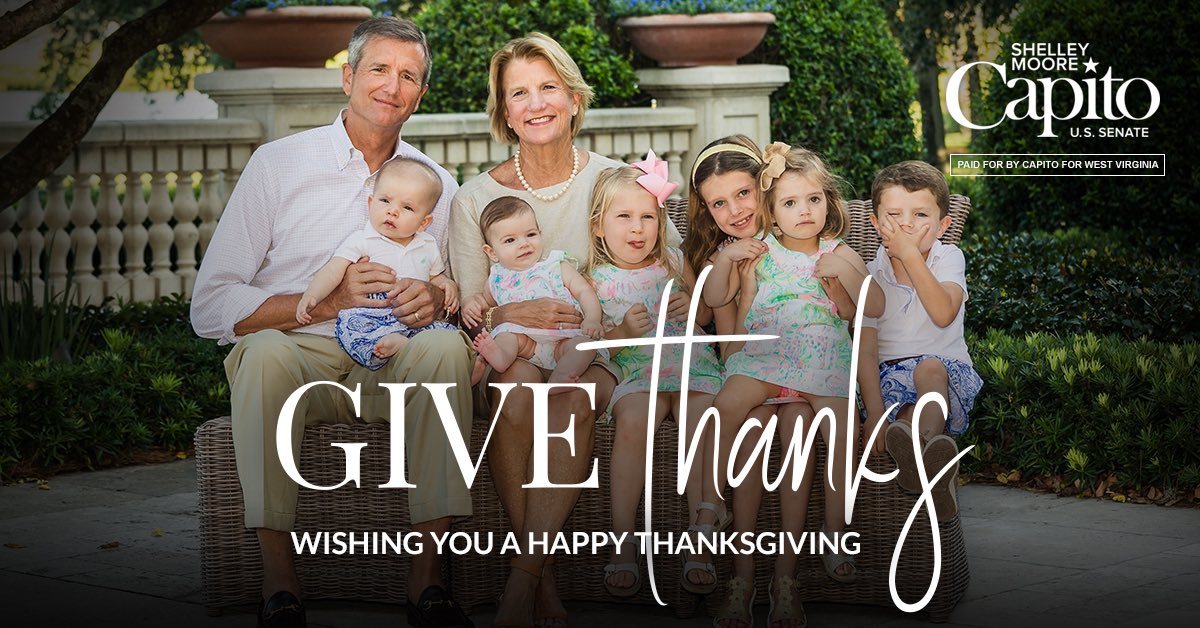 As we take time over the Thanksgiving weekend to give thanks, Charlie and I want to wish you and your family a Happy Thanksgiving. Read my full Thanksgiving message below. #HappyThanksgiving http://capito2020.com/2019/11/happy-thanksgiving-2019/ …pic.twitter.com/uT9764P5SK