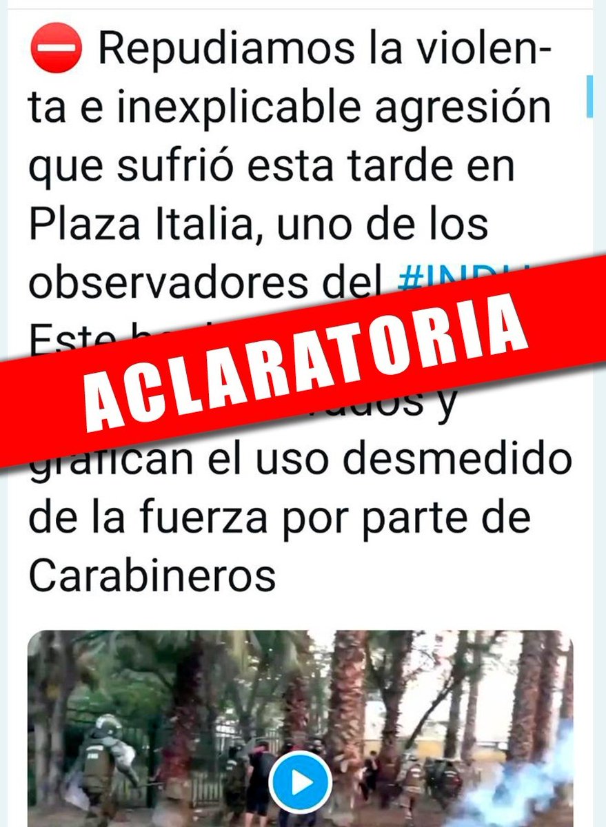 INDH reafirma categoricamente su repudio a la agresión contra el funcionario, el fotógrafo Claudio Pérez. Llegaremos hasta las últimas instancias para que se determinen la responsabilidad del ataque de @Carabdechile a un defensor de DDHH.