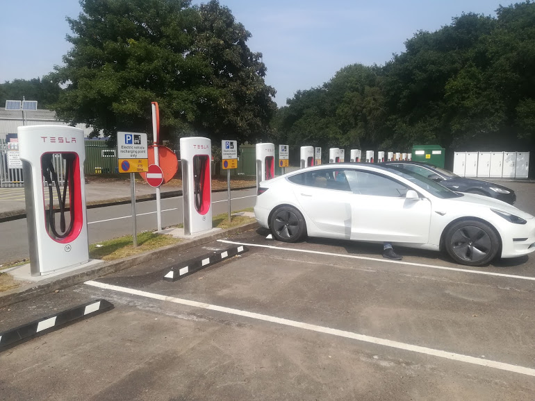 Awesome array of #tesla superchargers on the M6 - the future is here (and many other service stations now) #ElectricVehicles . Charged in 20 mins and away - loving the #teslamodel3 https://www.carbonfootprint.com/electric_vehicles.html … @TeslaUK @JohnBCarbonpic.twitter.com/PlA6BidSiB