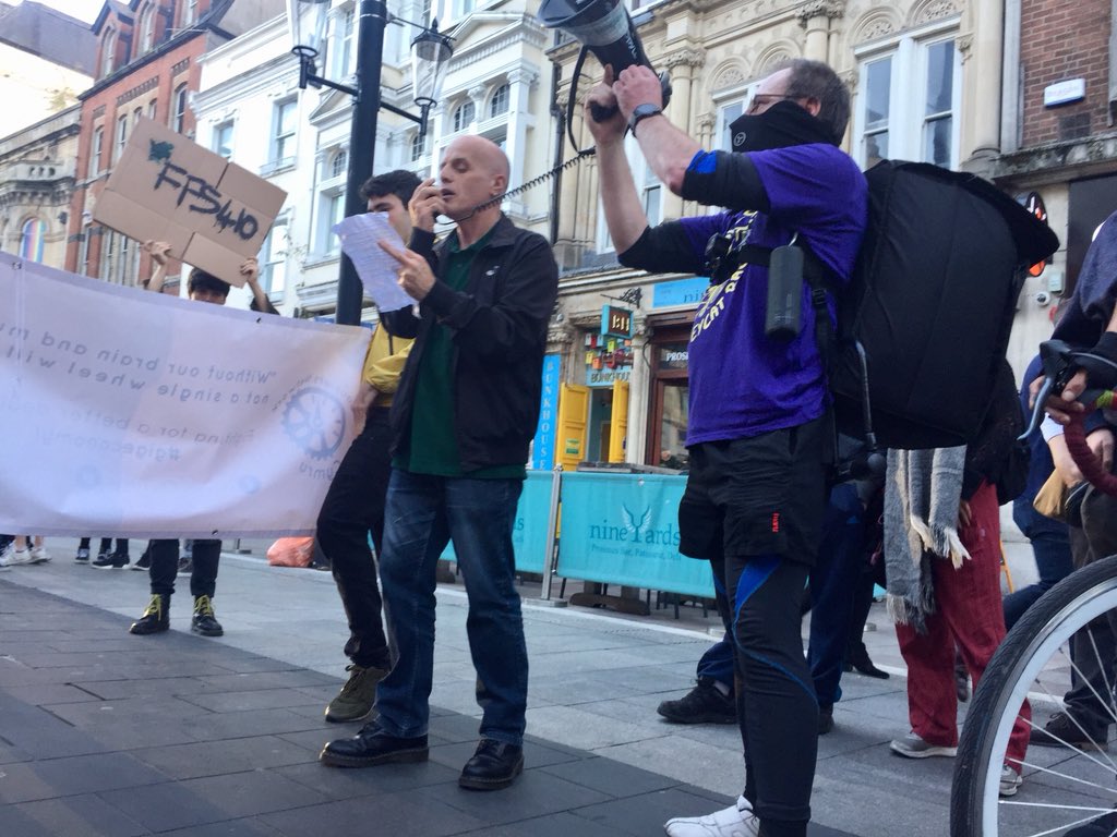 The @IWWCymru Cycle Network Cymru leading the rally demanding £5 per drop & £1 per mile. @cardiffucu there to support! #mcstrike #FFS410 #SpoonsStrike #AllEyesonTGIs @IWGBunion @IWW_Couriers @bfawu1 @RwUnite @walestucpic.twitter.com/o7Z2F6LsZM
