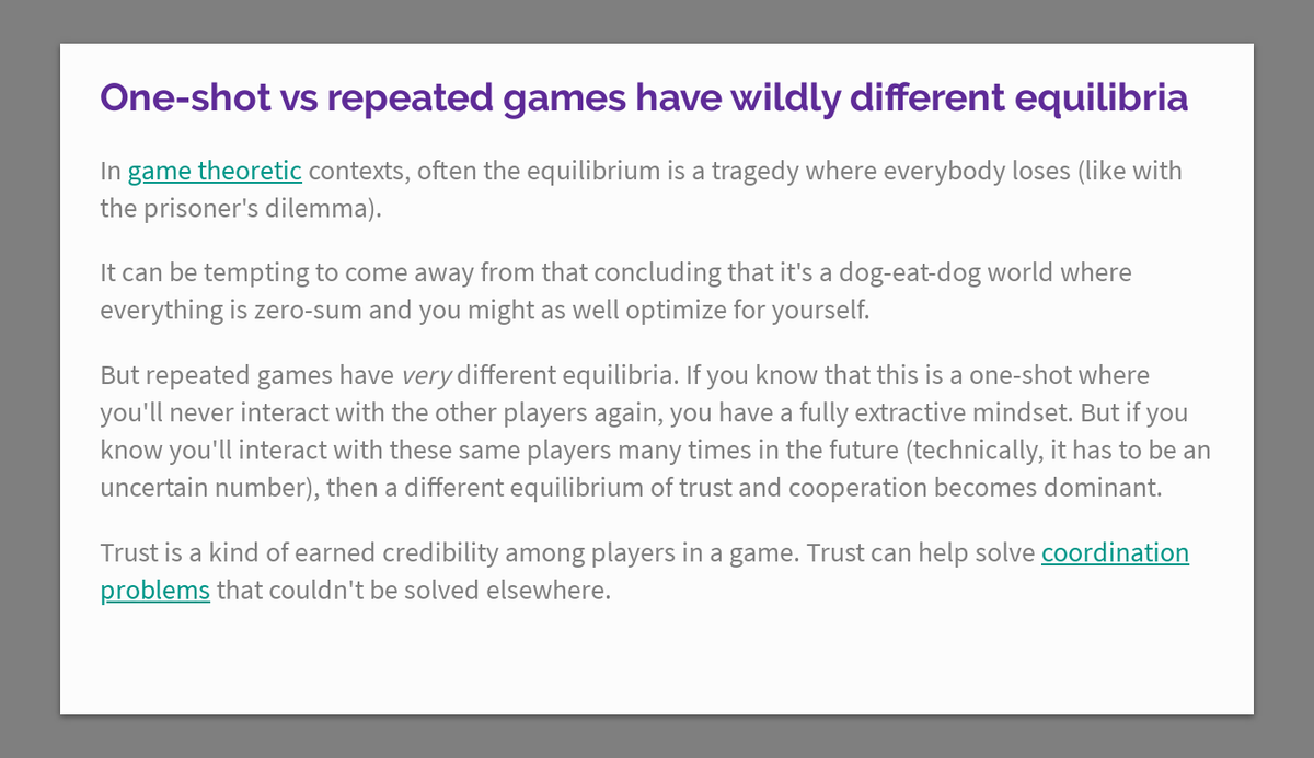 One-shot vs repeated games have wildly different equilibria https://thecompendium.cards/c/repeated-games-trust …pic.twitter.com/CezY47Te2p