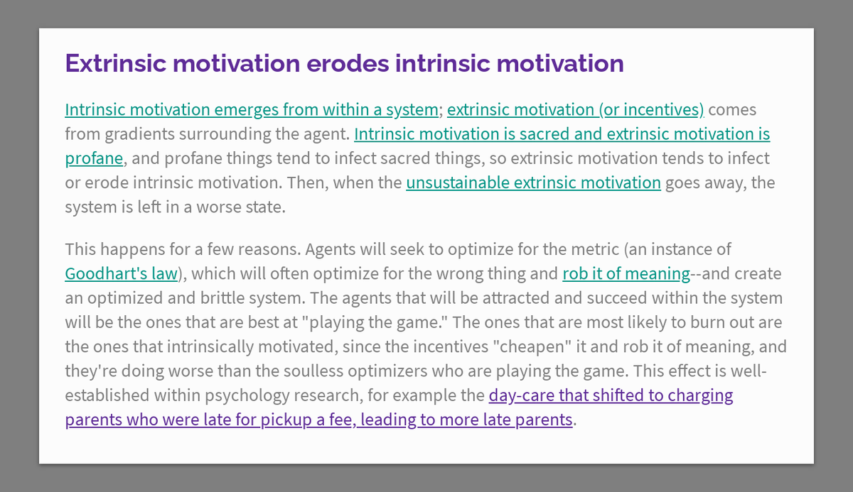 Extrinsic motivation erodes intrinsic motivation https://thecompendium.cards/c/extrinsic-motivation-erodes-intrinsic …pic.twitter.com/nbtr9mczDP