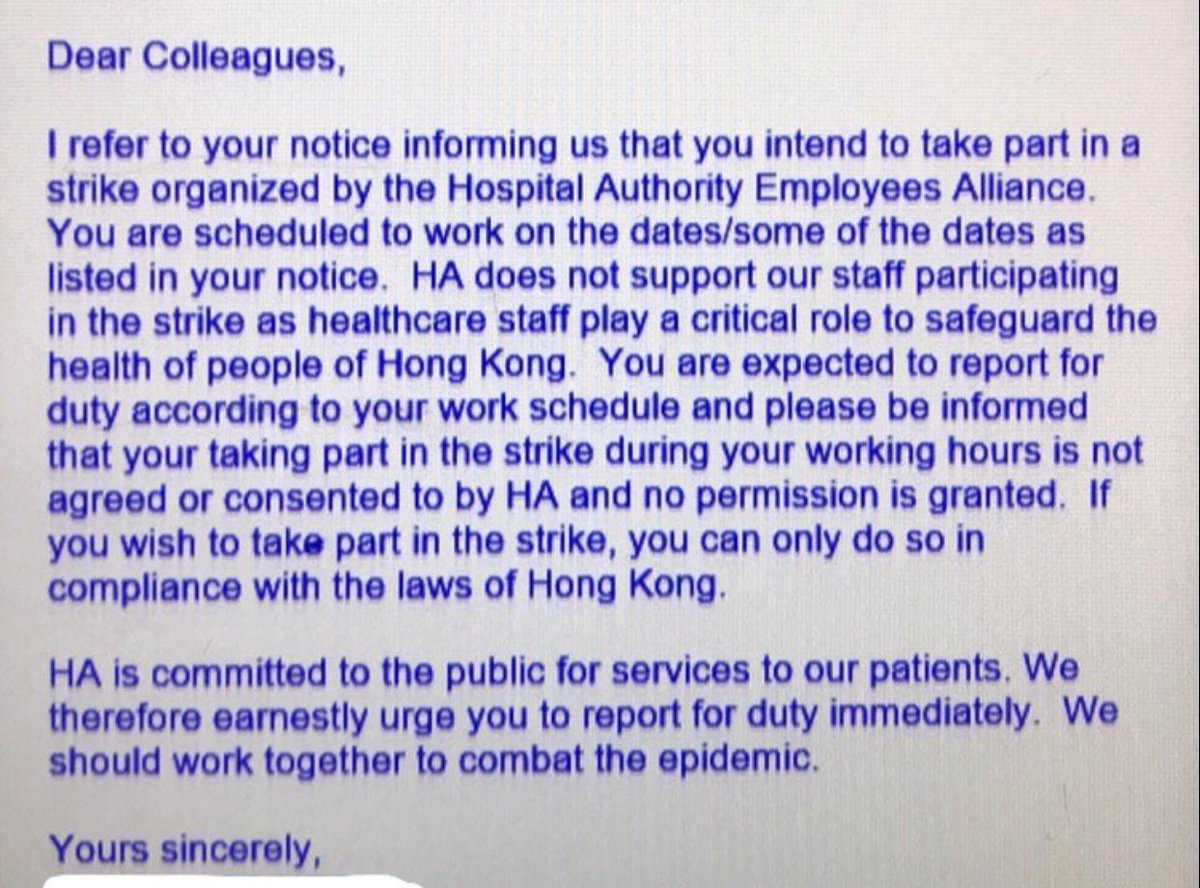 Letters allegedly fr Hospital Authority HR: "if you wish to take part in the strike, you can only do so in compliance w/ laws of HK." Staff demand complete Hong Kong border closure amid