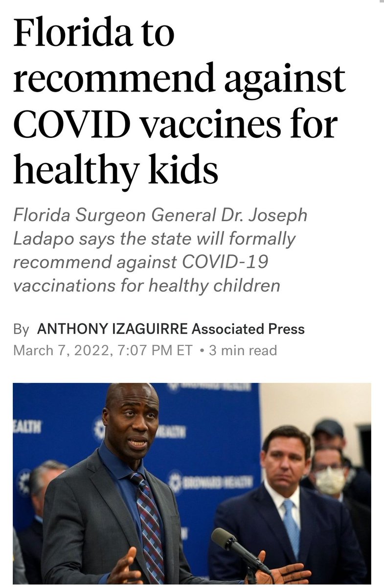Surgeon General Dr. Joseph Ladapo kündigte am Ende einer Diskussionsrunde an, daß Florida als erster US-Bundesstaat eine offizielle Empfehlung gegen die Covid-19-Impfung von gesunden Kindern aussprechen werde. https://abcnews.go.com/Health/wireStory/florida-recommend-covid-vaccines-healthy-kids-83299861 …pic.twitter.com/PXEvrqxPJz