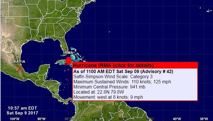 El huracán #Irma baja a categoria 3, lleva vientos de hasta 200 kmh, reporta el Centro Nacional de Huracanes de Miami.pic.twitter.com/9WMZQwtc0V