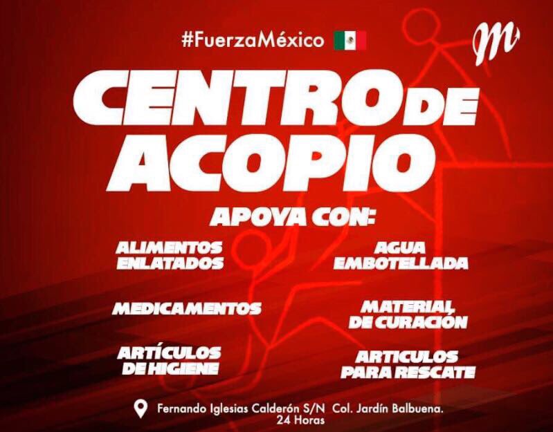 @DiablosRojosMX solicita los siguientes artículos en Centro de Acopio en Fray Nano para damnificados. #FuerzaMéxicopic.twitter.com/LzoIpi2iOi
