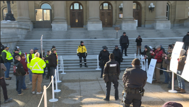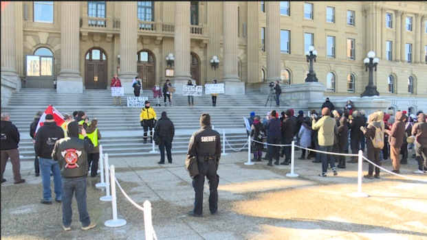 Another protest at the Alberta legislature today. This week the counter-protesters had the podium (Yellow Vest movement comes weekly on Saturdays), using their time to call out what they call are "radical patriots" like members of the so-called "Clann" who participate. #YEGpic.twitter.com/qbFsycQMvE
