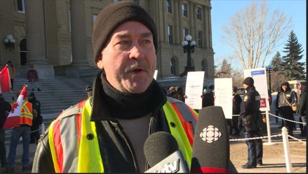 Jeff Sharpe with the Yellow Vest movement in Edmonton says the counter-protesters are "dividing the community when we should be uniting the community to stand up for civil rights", says online hate comments come from "trolls". #yegpic.twitter.com/Sda6sySOyZ