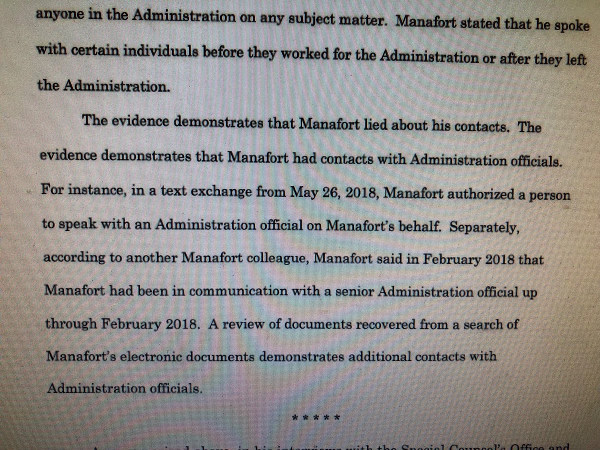 SCO in new filing: Manafort “lied about his contacts. The evidence demonstrates that Manafort had contacts with Administration officials... in a text exchange from May 26, 2018, Manafort authorized a person to speak with an Administration official on Manafort’s behalf.”pic.twitter.com/lQgQoSWVgM