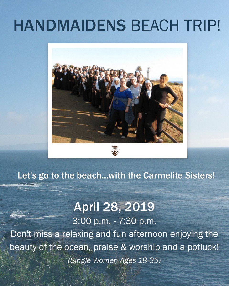 Let's go to the beach with the Carmelite Sisters! Handmaiden’s don't miss a relaxing and fun afternoon. Meet at Sacred Heart Retreat House at 1:45 pm to carpool OR at Point Vincente Interpretive Center. RSVP to heartofcarmel@outlook.com by April 27thpic.twitter.com/qqXdXnfr1V