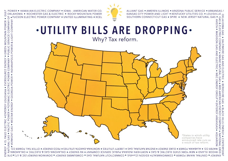 The #TaxCutsandJobsAct is leading to lower utility bills for 87 million customers across 48 states including Georgia! This isn't "crumbs" for working families, it's a big deal! #gagop #gapolpic.twitter.com/kPbbrV8kn3
