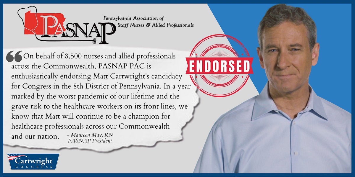 Thank you @PennaNurses SNAP for your endorsement. Nurses have been on the frontlines fighting this pandemic & putting themselves at risk to help our loved ones. I will continue to fight for more PPE & hazard pay to ensure every nurse has the resources they need & is paid fairly.pic.twitter.com/ErGuQMdgrA