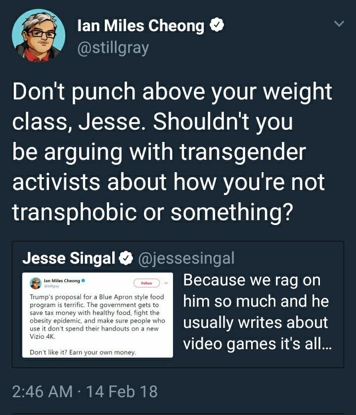 It was important that I actually had a message with that tweet, that it left people considering a bit more about that worldview. Likewise, I gathered quite a chunk of my audience from dragging Jesse "not a transphobe" Singal for about a month solid:https://twitter.com/CaseyExplosion/status/926115275396866048 …