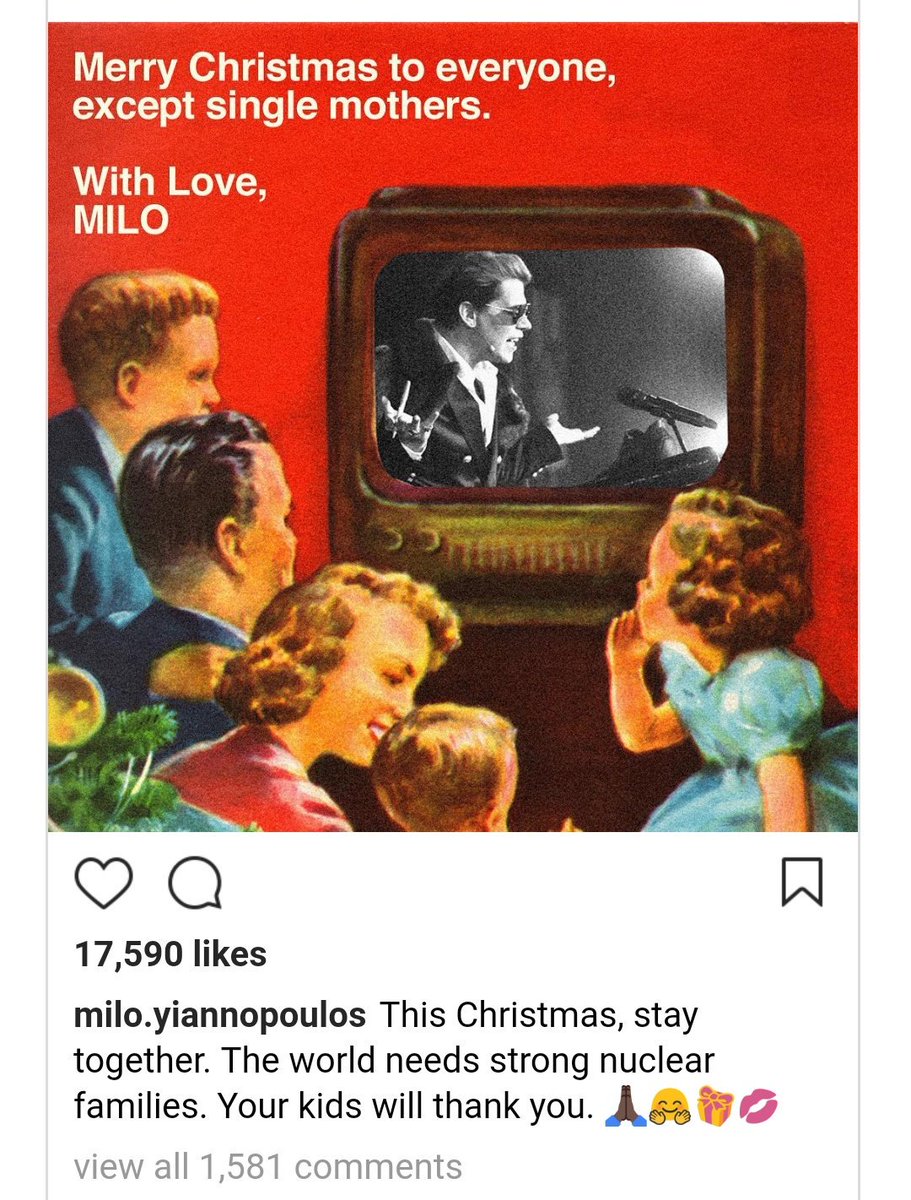 In reading this recent article about Milo, an image is featured. https://usa.spectator.co.uk/2018/04/the-fall-of-milo-yiannopoulos/ … It harkens back to simpler times, nuclear families of the 1950's, where LGBT people had no place. A more... civilized society, as The Operative might have put it.pic.twitter.com/d6QqI5TRJ1