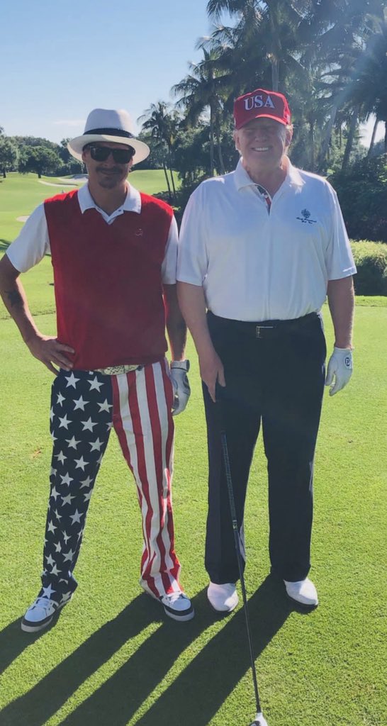 Another great day on the links! Thank you to POTUS for having me and to EVERYONE at Trump International for being so wonderful. What a great man, so down to earth and so fun to be with!! KEEP AMERICA GREAT!! -Kid Rock pic.twitter.com/cSsswI5PbW