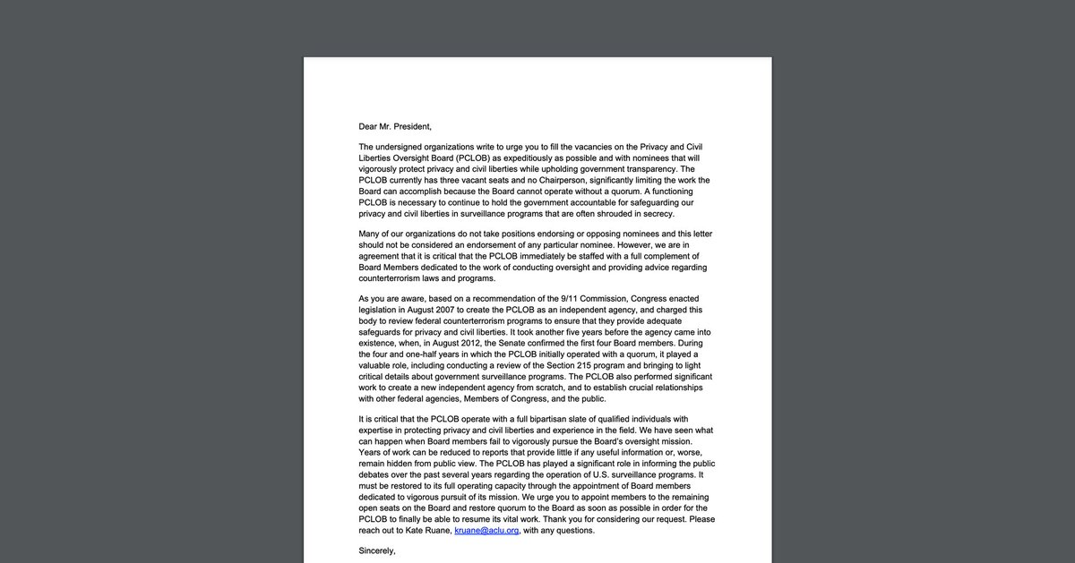 @CenDemTech is urging the@WhiteHouse to appoint defenders of#privacy & civil liberties to three vacancies on the@PCLOB_GOV. We joined 18 other orgs in a letter calling on the President to do this *quickly* b/c PCLOB cannot operate without a quorum. https://cdt.org/insights/cdt-urges-biden-to-appoint-members-to-pclob-key-oversight-body/ …pic.twitter.com/MzM4zAlLcf