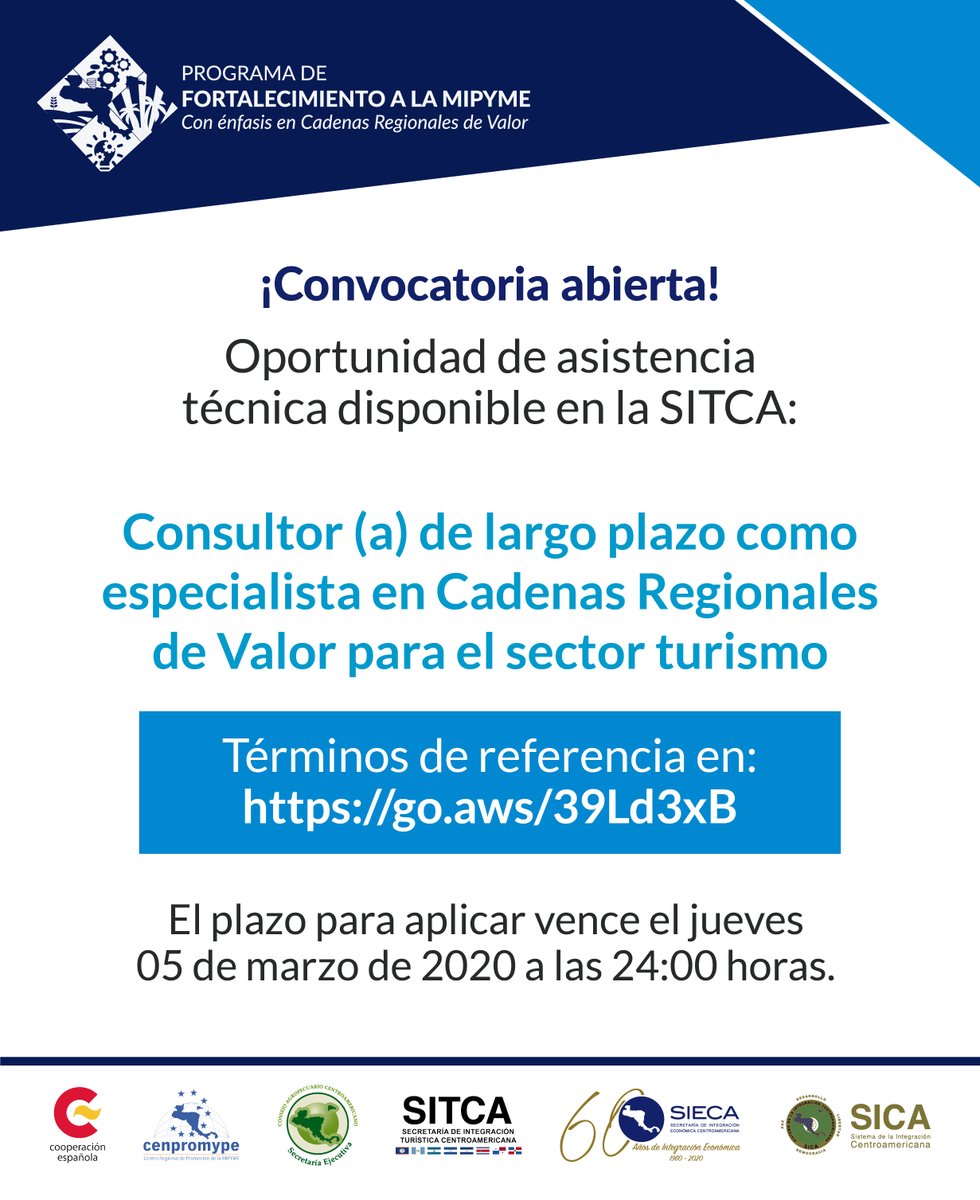 La SIECA comparte la oportunidad de asistencia técnica disponible en la SITCA: Consultor(a) de largo plazo como especialista en Cadenas Regionales de Valor para el sector turismo: https://go.aws/39Ld3xB El plazo para aplicar vence el jueves05 de marzo de 2020 a las 24:00 horaspic.twitter.com/d7gBIN4q6s