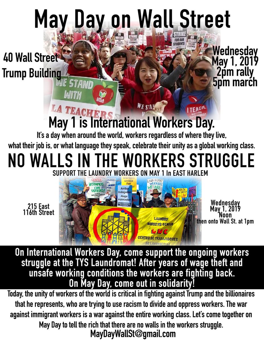 On International Workers Day support the ongoing workers struggle at TYS Laundromat! After years of wage theft and unsafe conditions the workers are fighting back. Demonstrate solidarity 12noon 215 East 116th St then come to Wall St