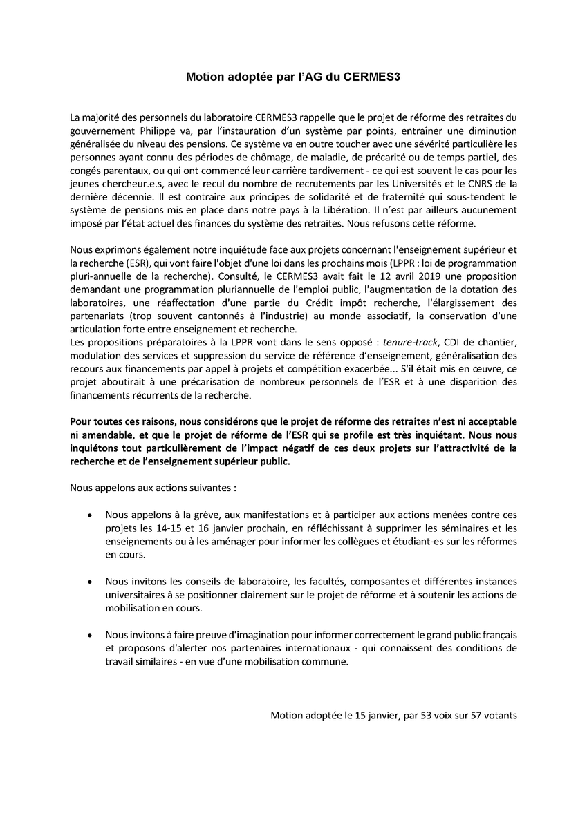 Projet de réforme des retraites et projet de réforme de l’ESR : motion adoptée par l’assemblée générale du Cermes3 : http://www.cermes3.cnrs.fr/fr/ pic.twitter.com/qNmn5xdmC3